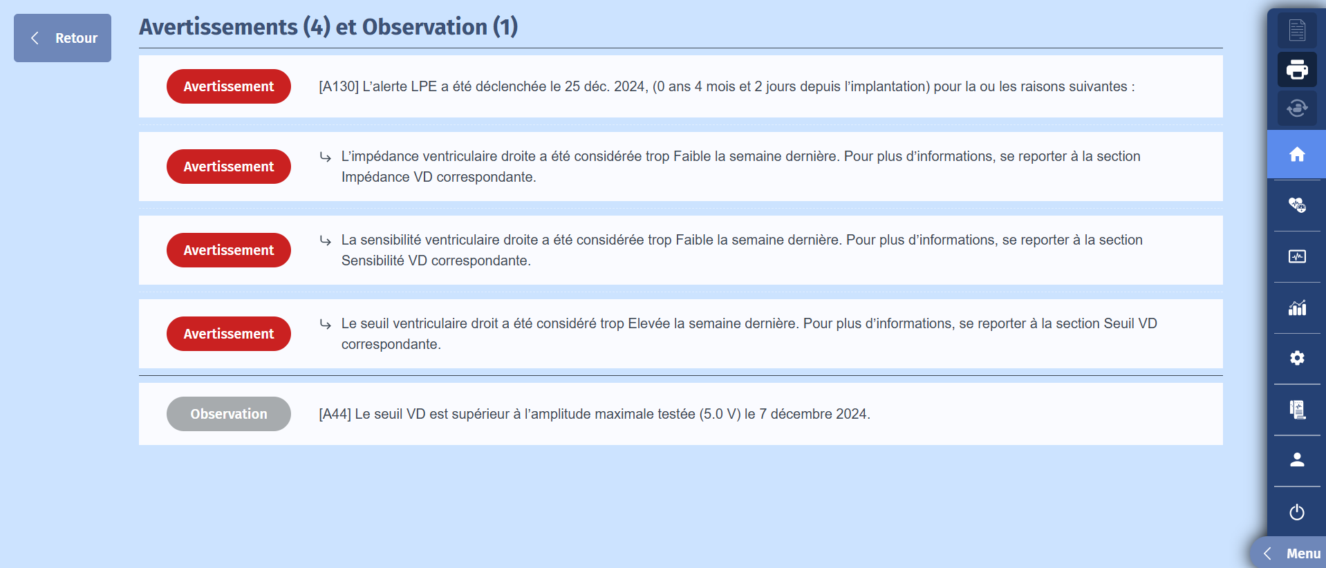 La liste des alertes confirme la présence de l'alerte Lead Parameter Evaluation (LPE) basée sur les changements dans l'amplitude de détection, le seuil automatique et l'impédance. Il existe également une ancienne alerte pour le seuil RV uniquement.