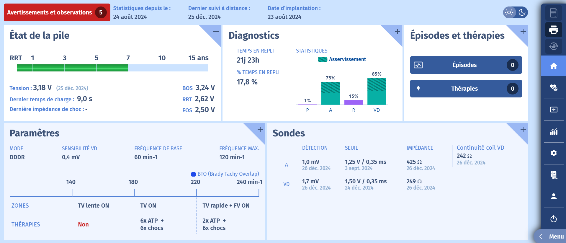 Les tendances de la sonde montrent que depuis quelques jours, les paramètres de la sonde se sont détériorés avec de faibles valeurs détectées, des seuils de stimulation élevés ou hors limites et une diminution de l'impédance. En fait, une alerte avait déjà été envoyée quelques jours auparavant en raison de l'impossibilité d'effectuer un seuil de stimulation, mais l'examen de la sonde n'a révélé aucun autre argument en faveur d'un dysfonctionnement de la sonde à ce moment-là et l'évaluation minutieuse à distance a été poursuivie. En raison d'une forte suspicion de dysfonctionnement de la sonde VD, les thérapies ont été désactivées et une radiographie du thorax a été réalisée, montrant un déplacement de la sonde OD et VD.